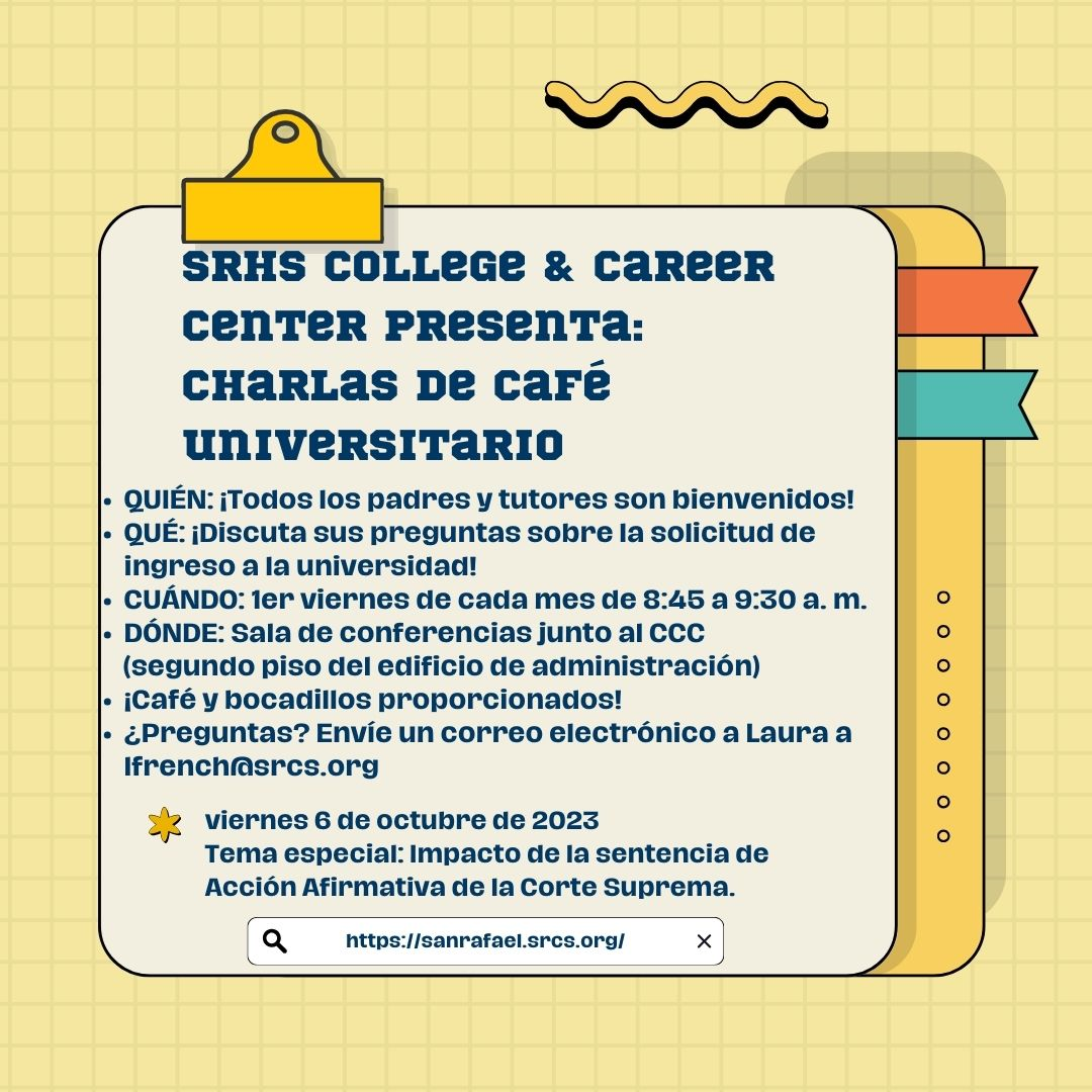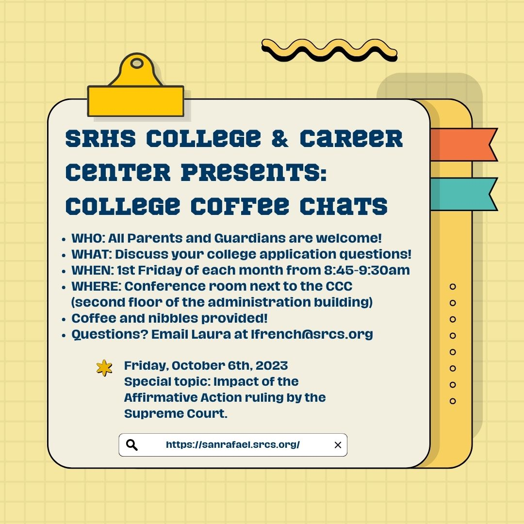 It is a very busy time of year for seniors getting ready to apply for college. Be sure to visit the HeadsUp College Consultants in the CCC at each high school. Laura French at San Rafael High and Matt Slavin at Terra Linda High. Both are excellent resources for helping your student! San Rafael High School is now offering College Coffee Chats the first Friday of every month. Be sure to check it out!