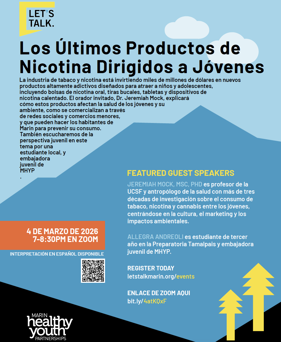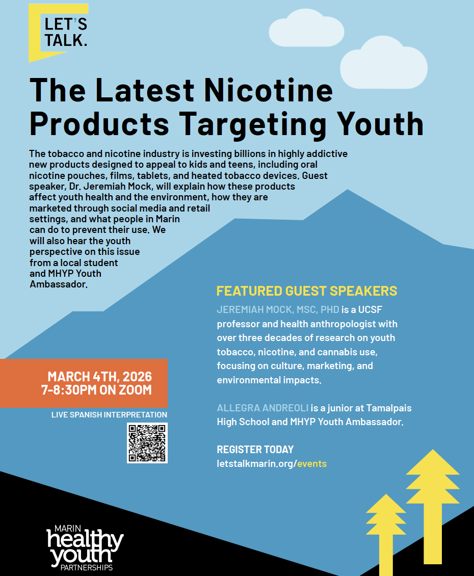 The event, “The Latest Nicotine Products Targeting Youth,” will feature Dr. Jeremiah Mock from UCSF, who will break down what these products are, how they’re being marketed and what families should know. We’ll also hear directly from a local student and MHYP Youth Ambassador. Spanish interpretation will be available. Learn more and register.